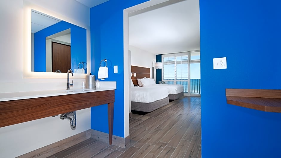 This room features a 43 inch high-definition flat-screen TV and USB charging stations. A full size refrigerator and microwave are also available. A private balcony is available for guests to enjoy. A work area with an ergonomic chair is also included.